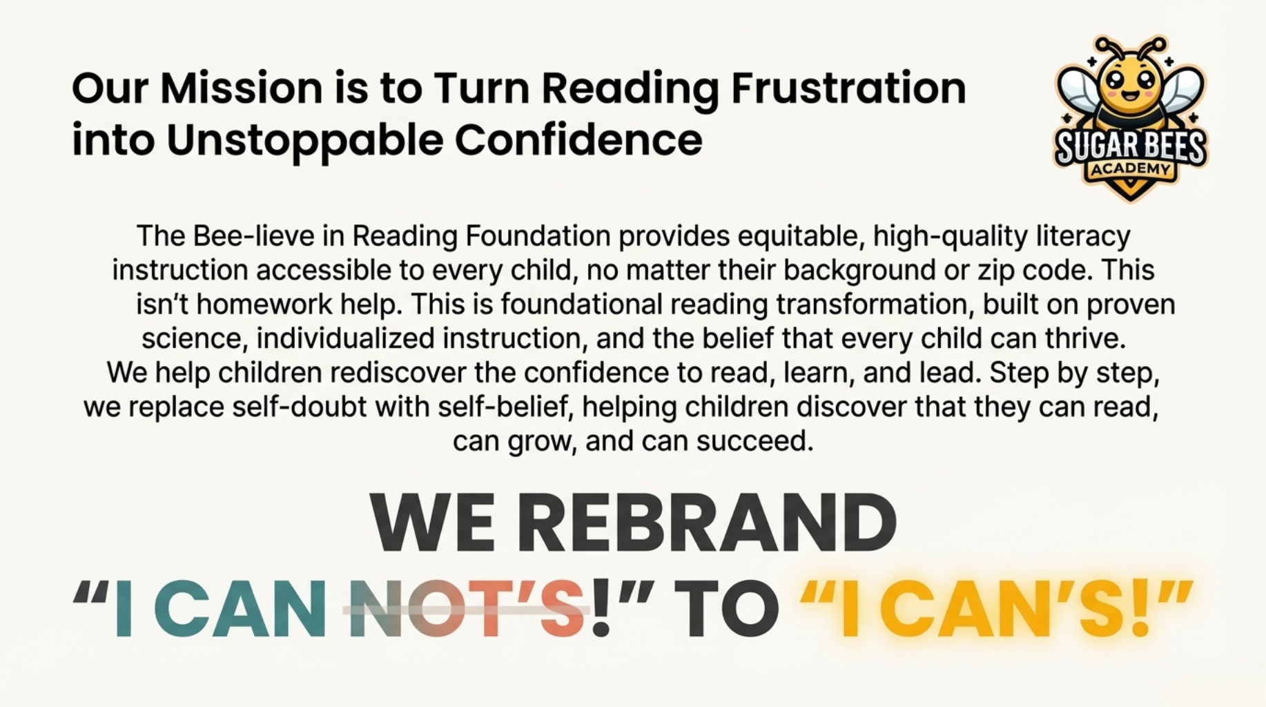 Because every child deserves the power to read, dream, and thrive, the Bee-lieve in Reading Foundation, founded by Sugar Bees Academy, exists to remove financial barriers to literacy. Through community-funded programs, we provide free and low-cost reading support to children who are struggling to read at grade level.